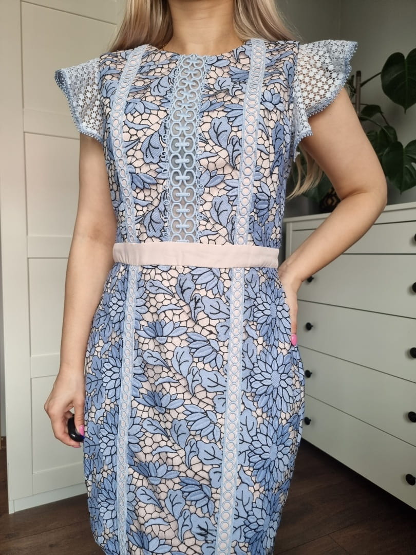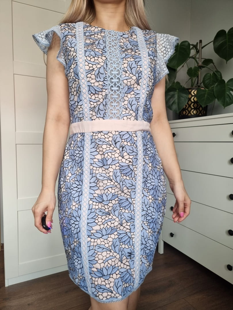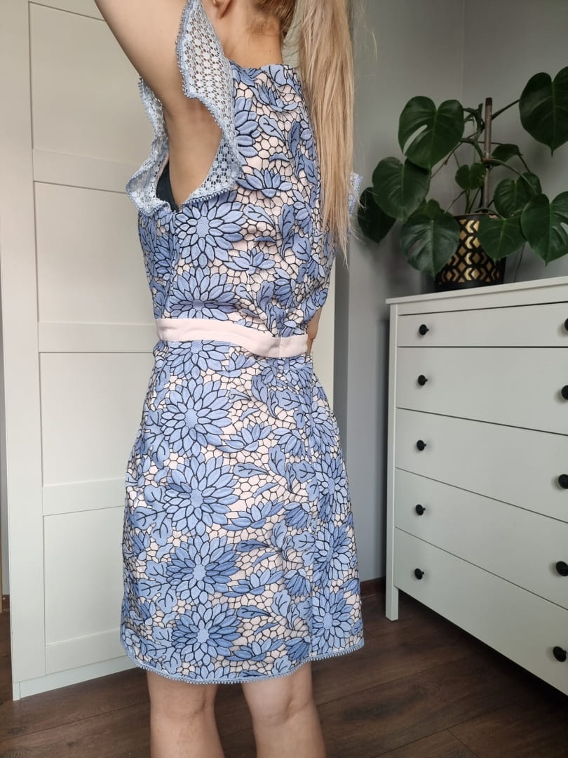 Śliczna, kobieca sukienka, cała z misternie wykonanej koronki. Delikatna, jasnoróżowe poszewka. Falbanki na ramionach. Sukienka jest nowa z metkami.