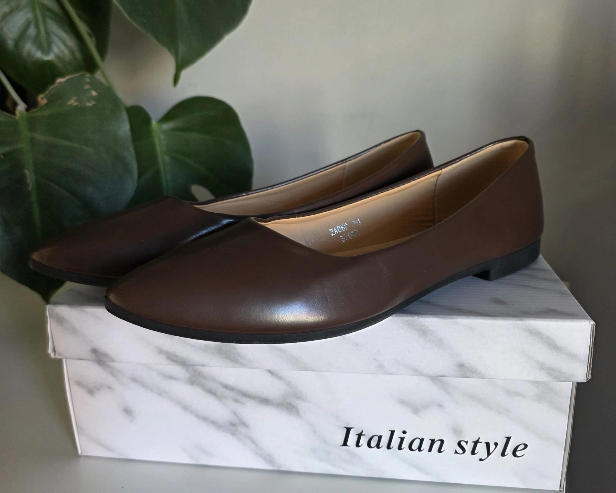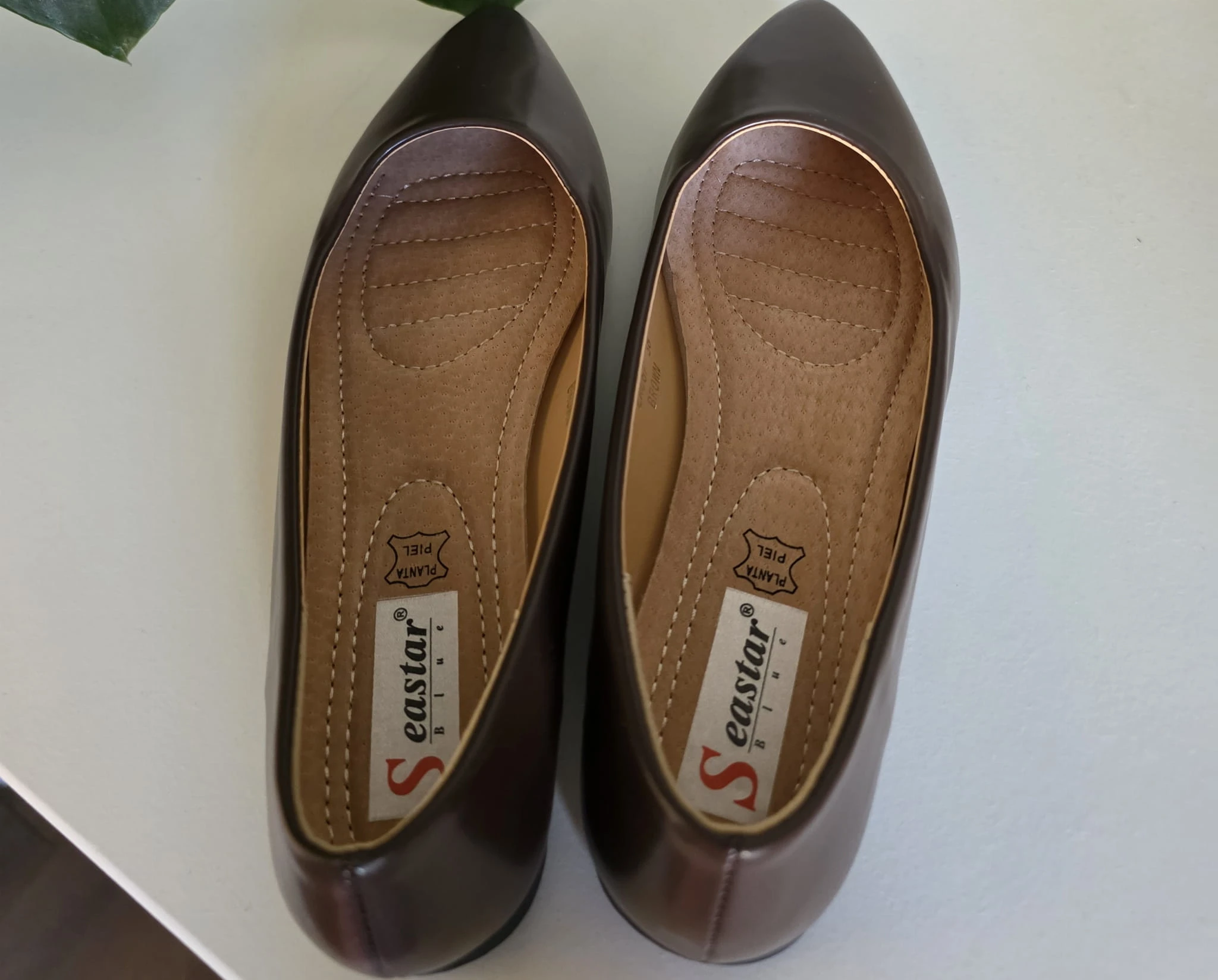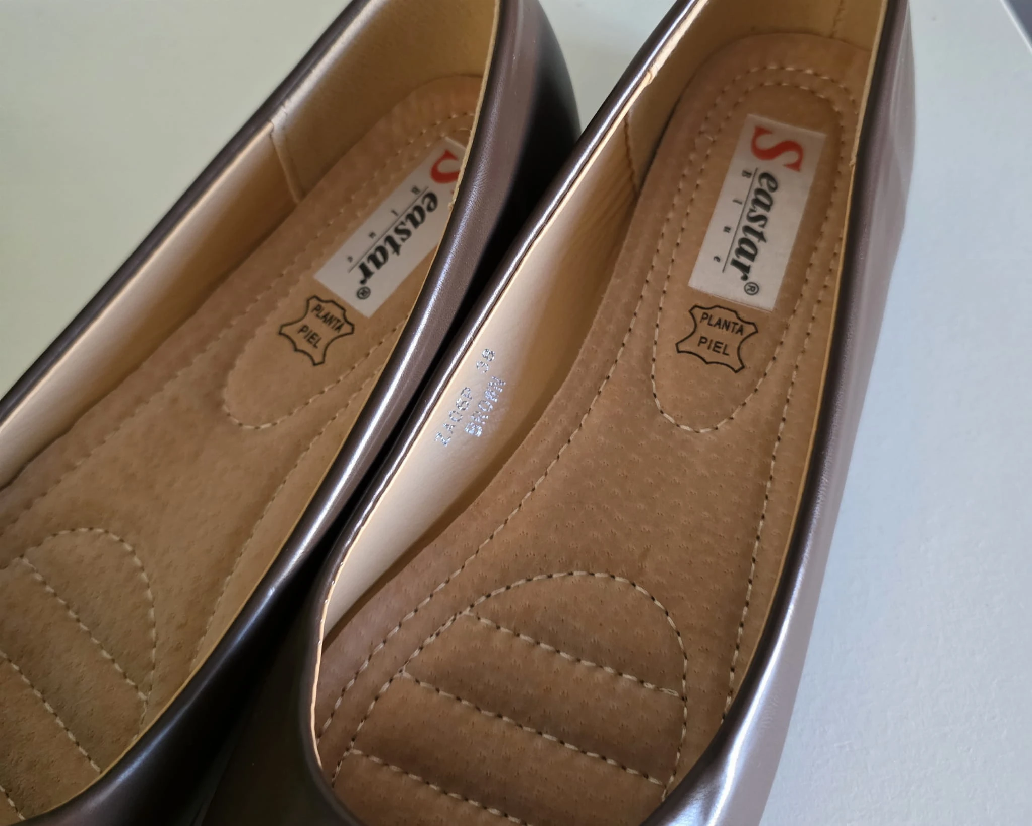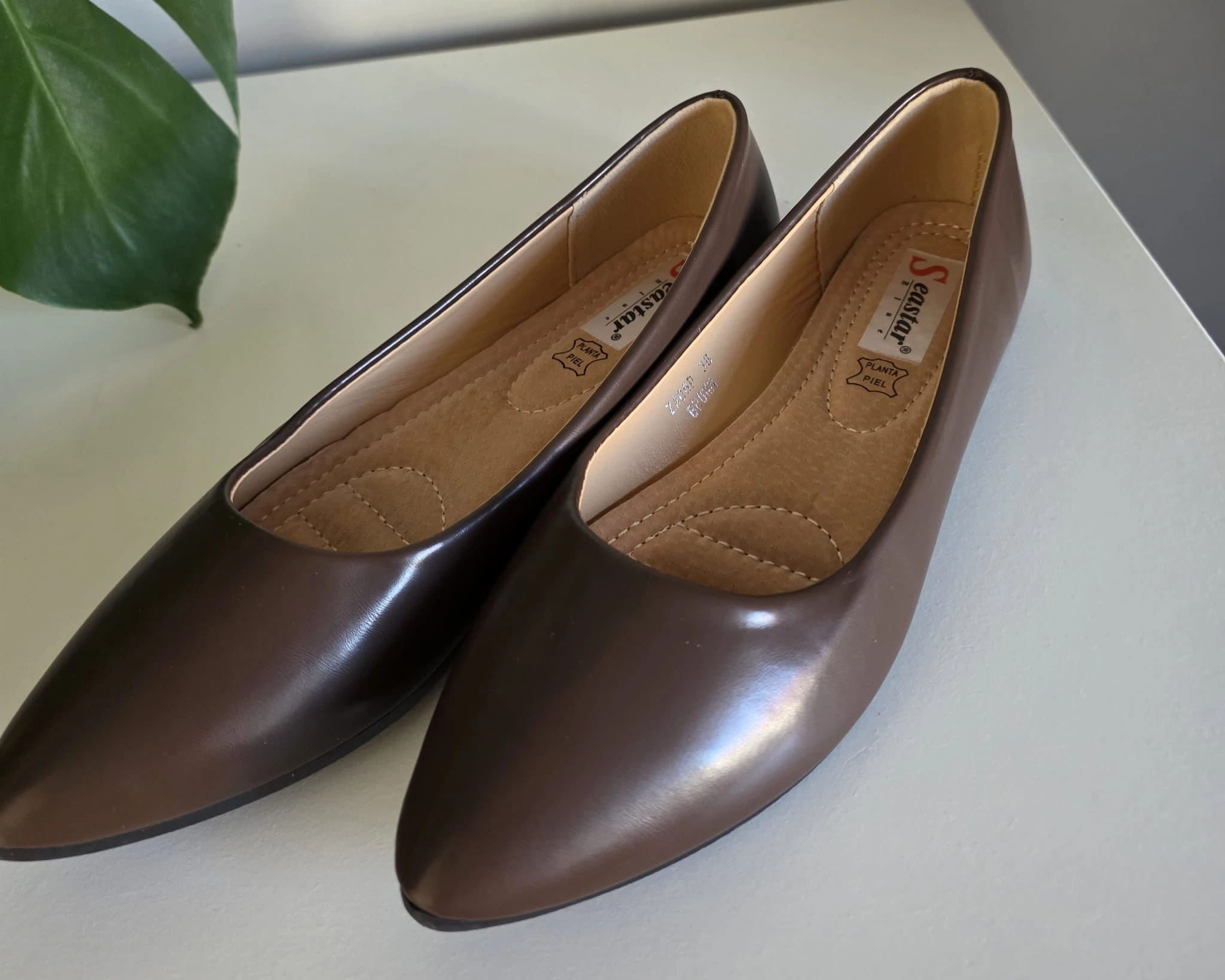 Eleganckie baleriny marki Seastar w ponadczasowym, brązowym kolorze. Wykonane ze skóry ekologicznej, z naturalną skórzaną wkładką dla większego komfortu. Lekka gumowa podeszwa zapewnia wygodę na co dzień.