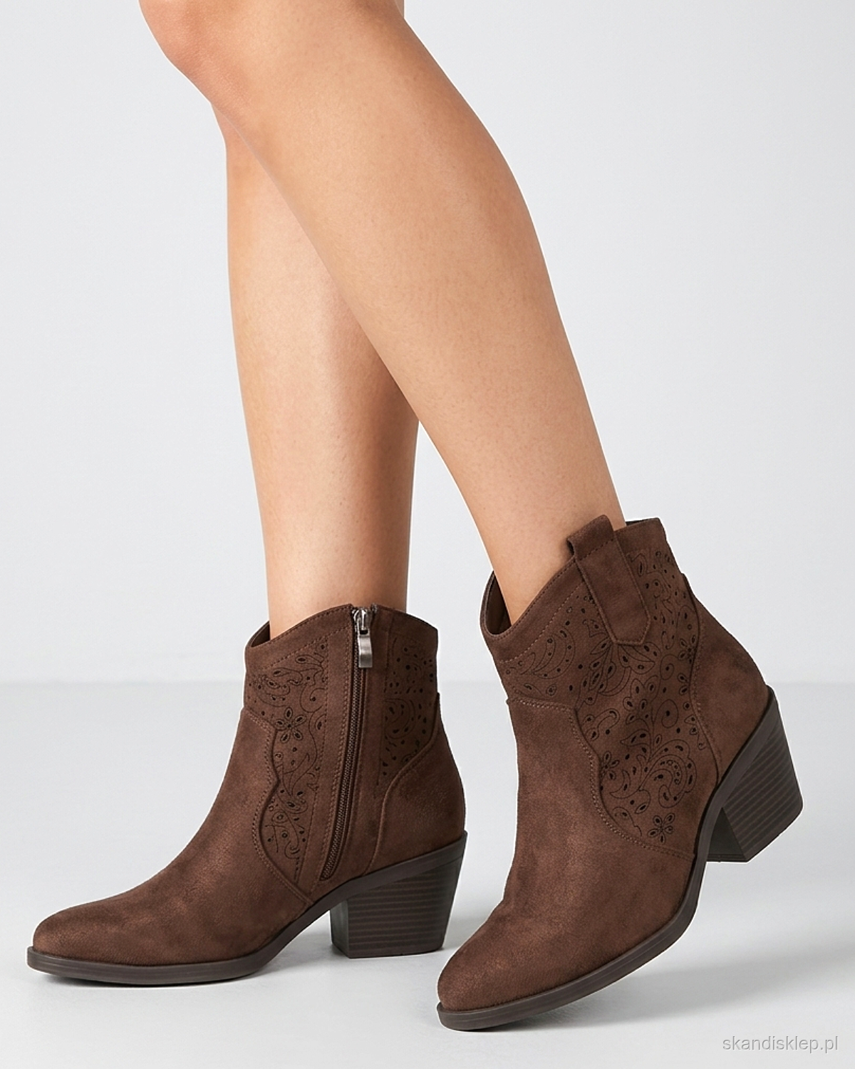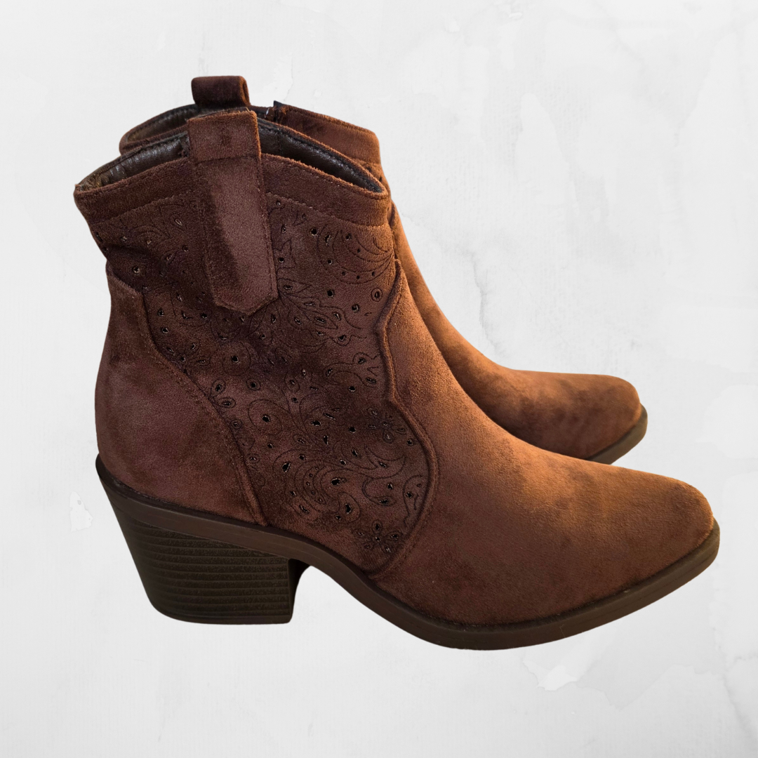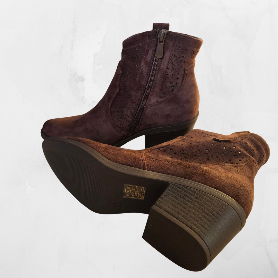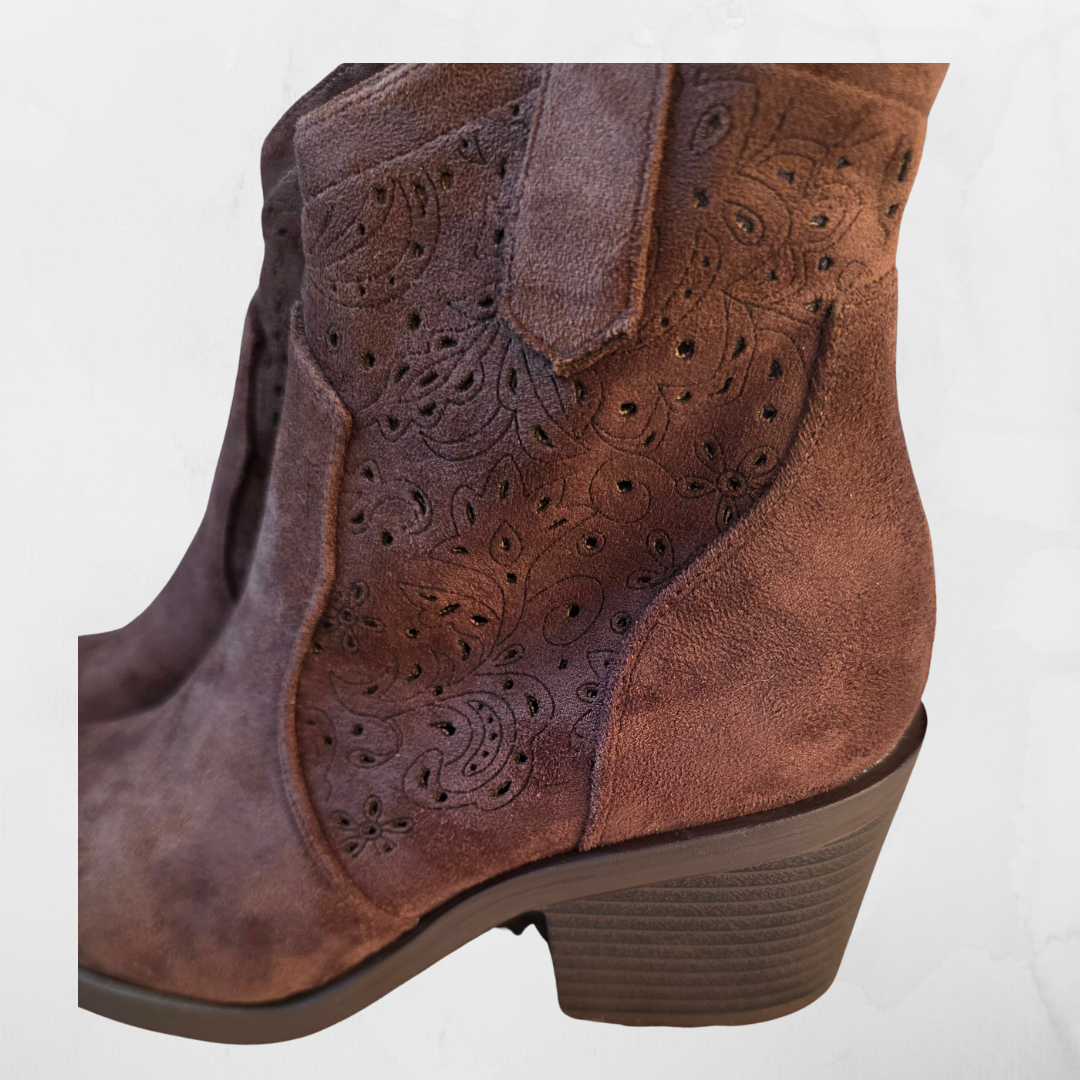 Zamszowe Botki Kowbojki Ażurowe – Czekoladowy Brąz