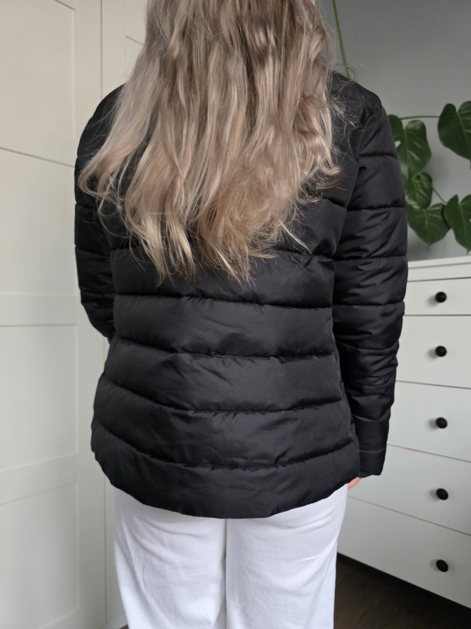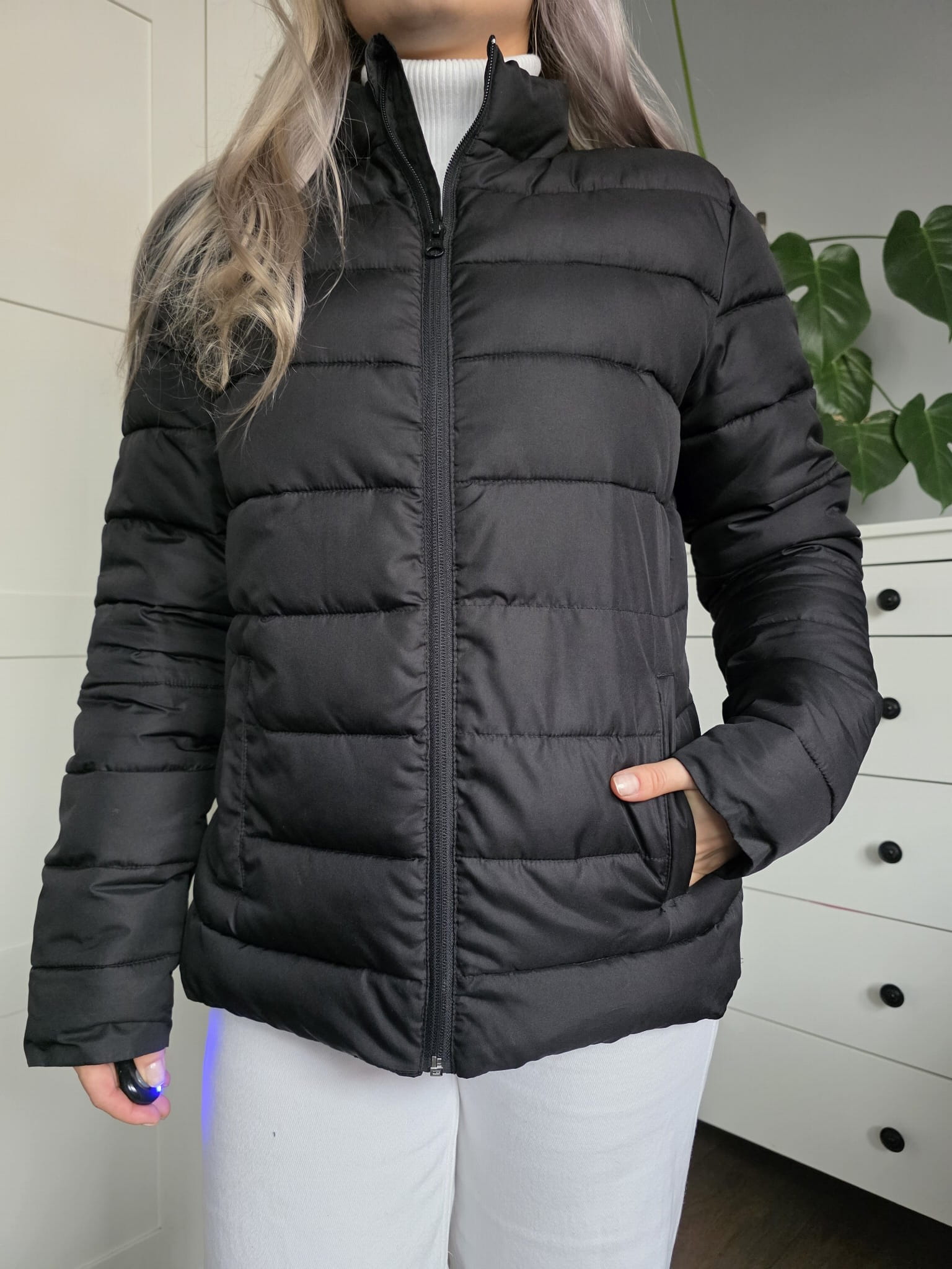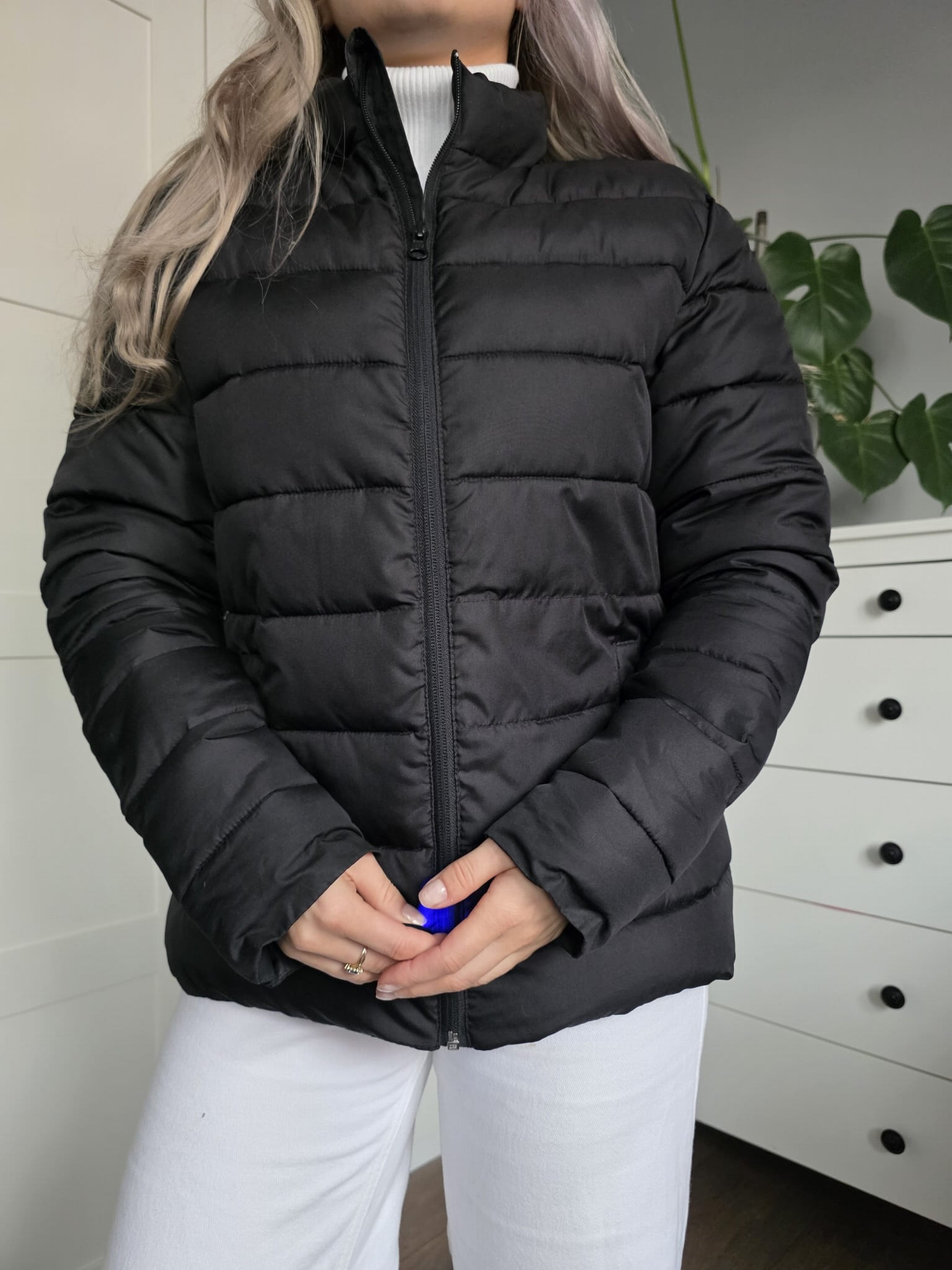 Czarna pikowana puchowa kurtka krótka klasyczna kieszenie