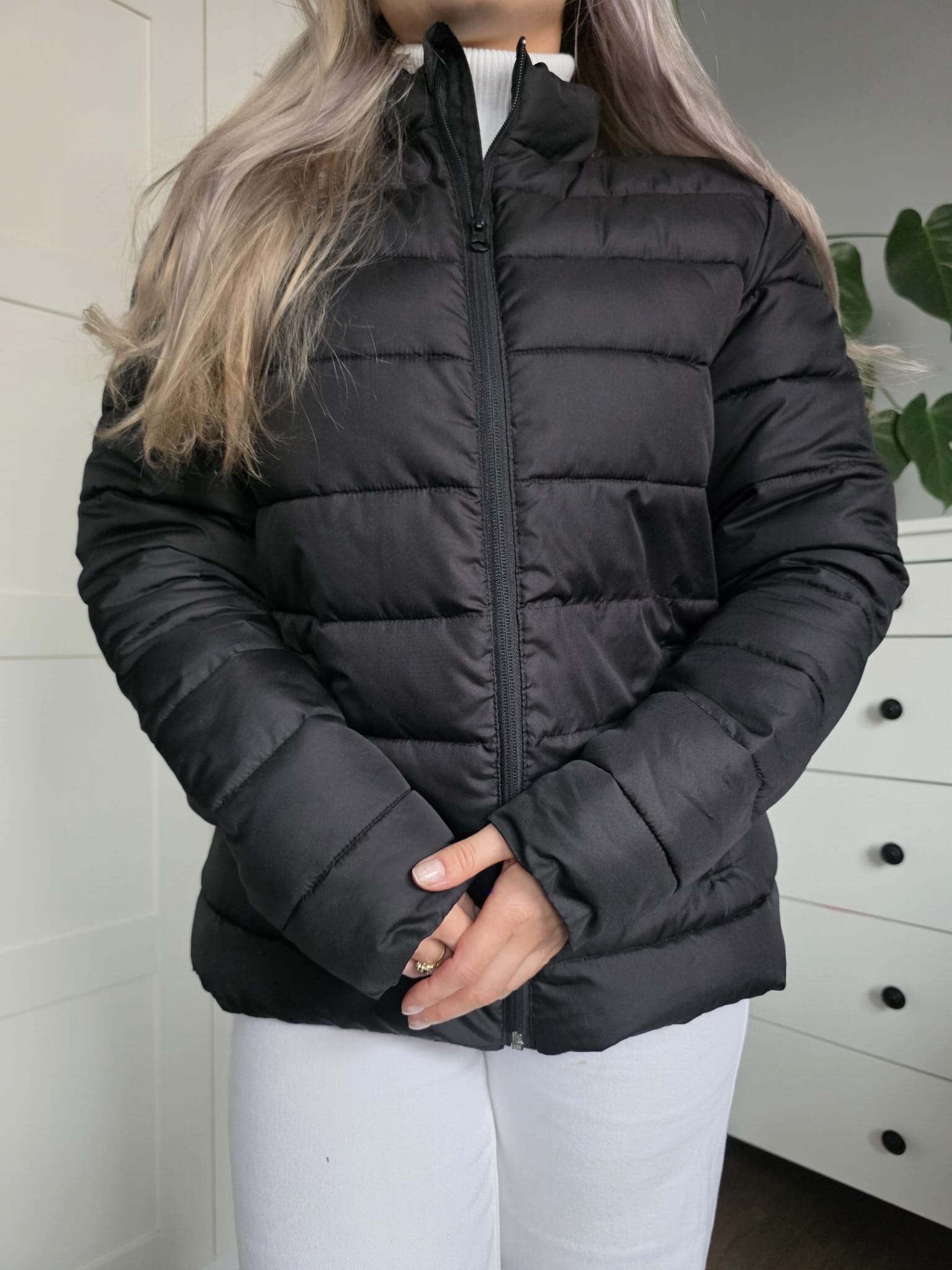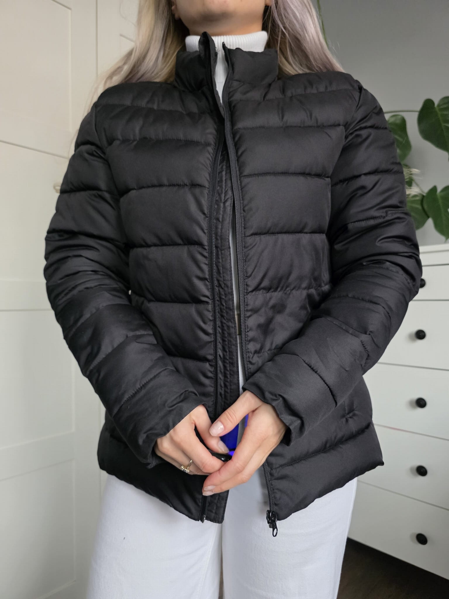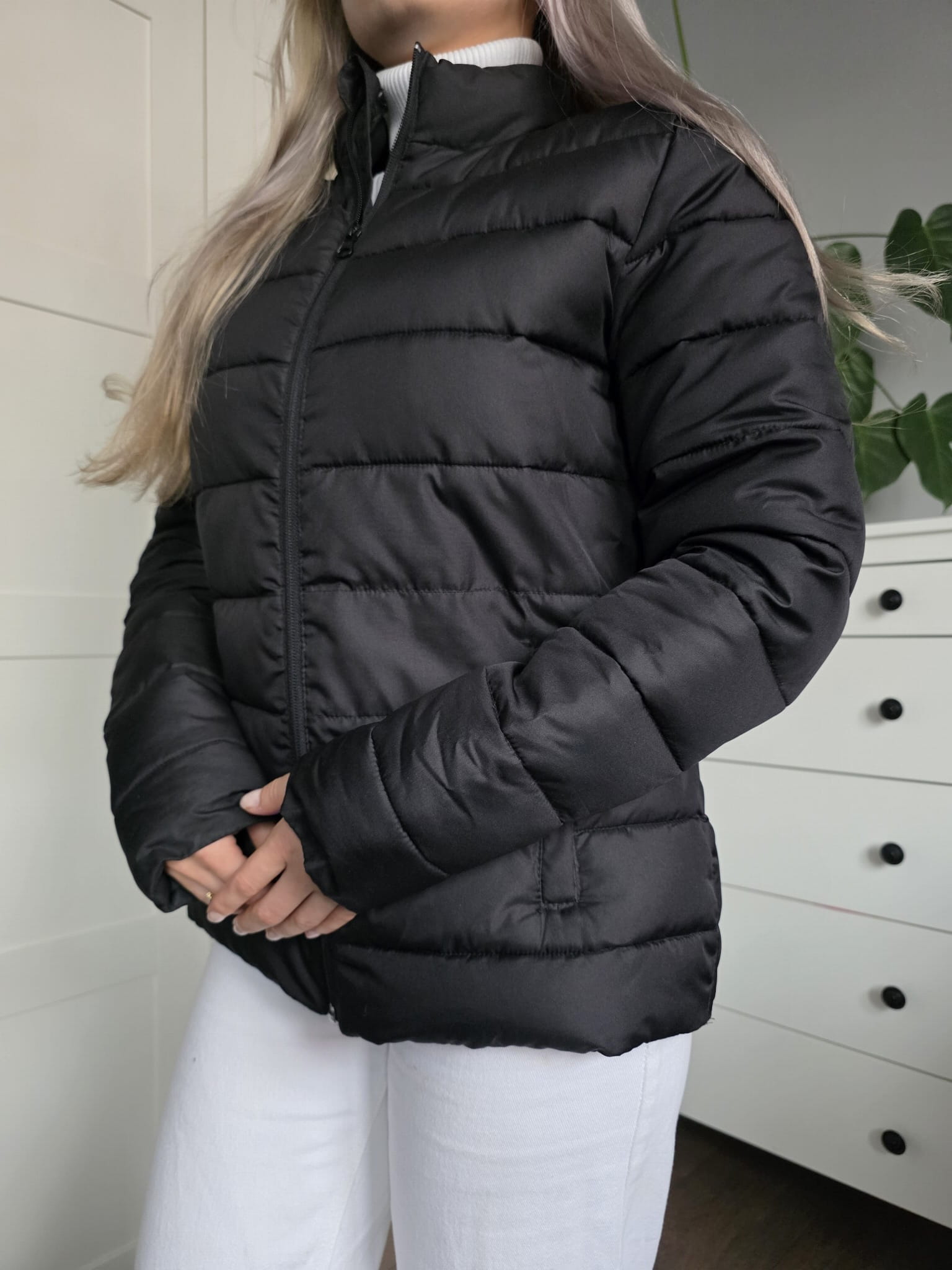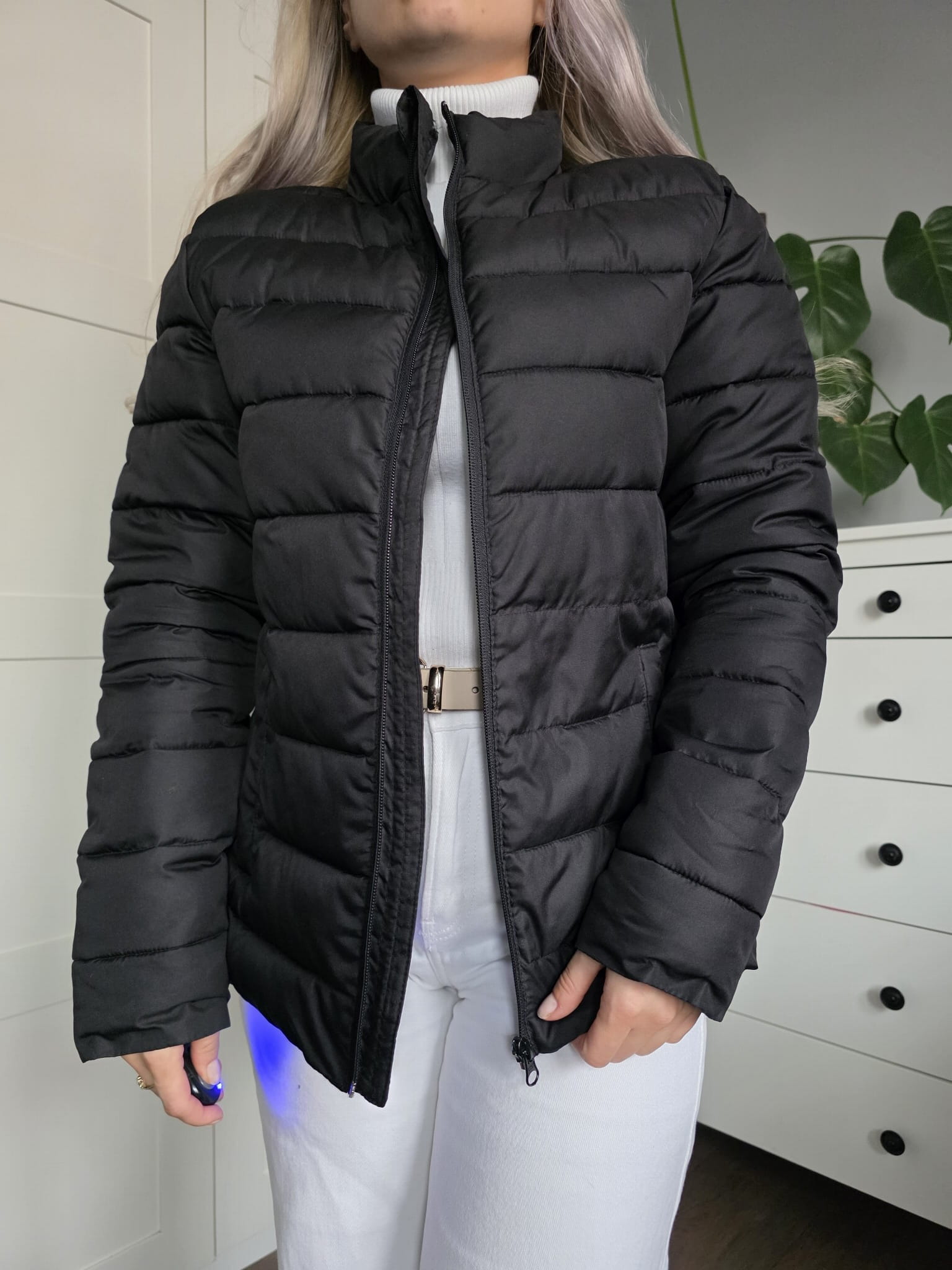 Czarna pikowana puchowa kurtka krótka klasyczna kieszenie