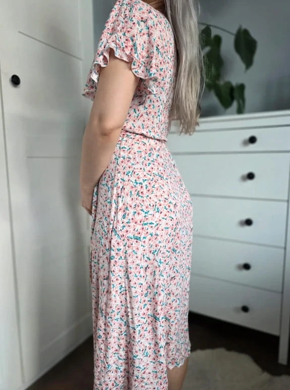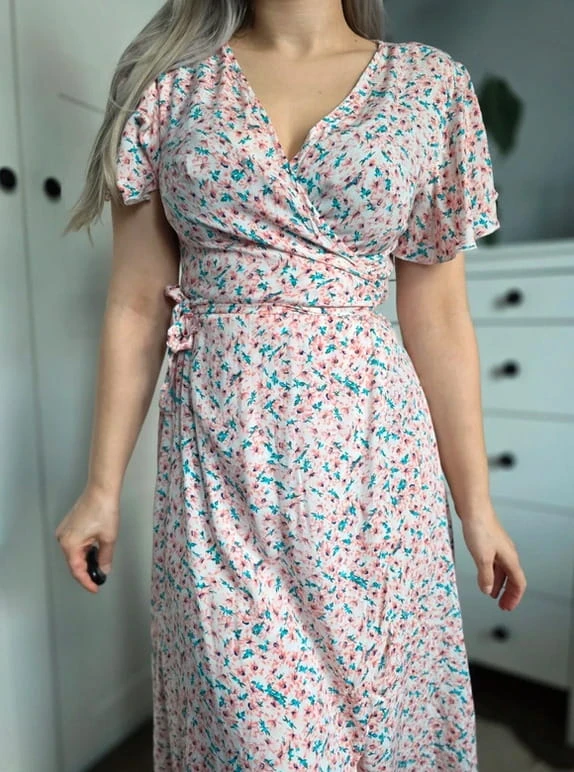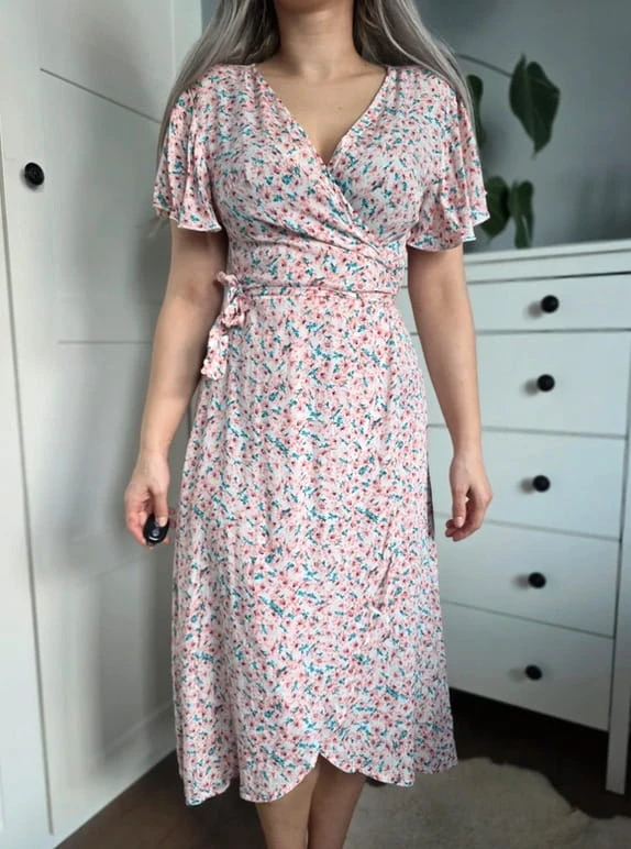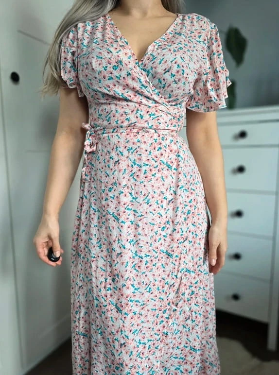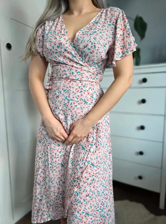 Sukienka kopertowa w kwiaty midi wiosenna wiązana pudrowy róż turkus S 36