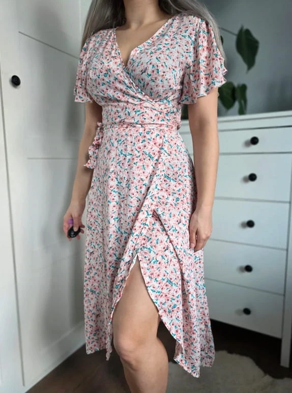 Urocza sukienka midi w delikatny kwiatowy wzór w odcieniach pudrowego różu i turkusu. Kopertowy krój pięknie modeluje sylwetkę, podkreślając talię i biust, a zwiewny materiał zapewnia komfort noszenia przez cały dzień.